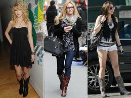 Tem um designe mas rústico, o bico é alongado e fino, o salto quadrado e baixo, o modelo do cano é sua marca registrada, é sempre incrementada com fivelas, taxas e desenhos. Ainda não encontrei uma que seja especialmente pra mim, mas acho lindo quem não tem medo de usar como a Miley Cyrus que fica linda quando usa com shortinhos.